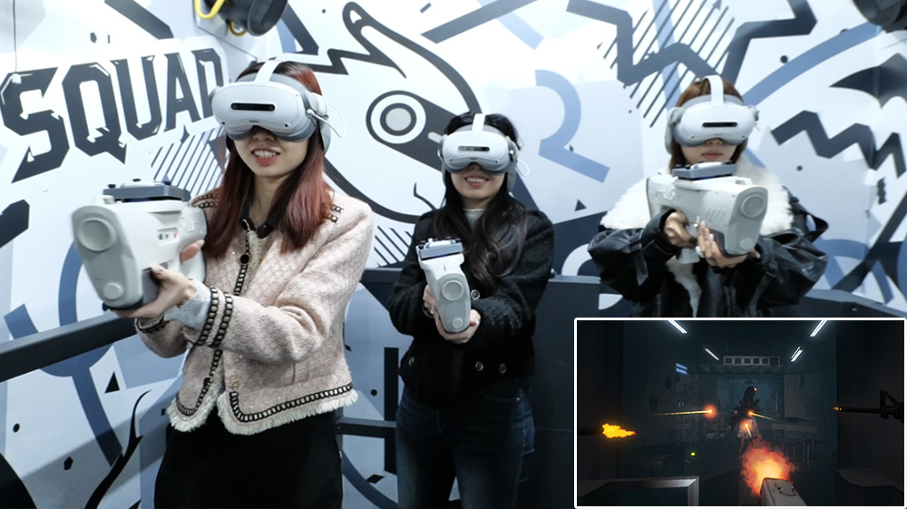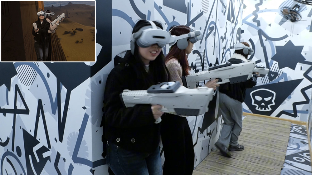 4、用戶無需背負(fù)沉重設(shè)備,僅需佩戴輕量化頭顯與動捕手柄 (科幻槍模),即可在虛實(shí)融合的開放場景中自由行走互動